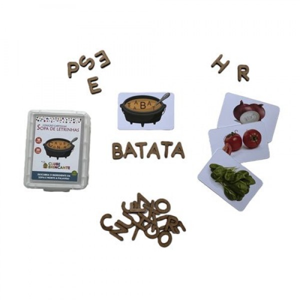 O objetivo do material descobrir qual a palavra está embaralhada na sopa e monta-la usando as letras. Também pode usar o verso da carta que tem a imagem real da palavra. Todas as palavras são ingredientes que usamos na sopa, o que possibilita ampliar o material e usar de outras formas.