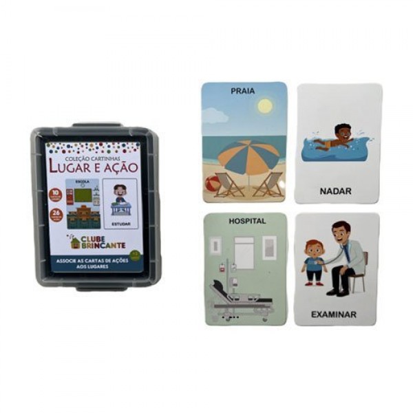 O objetivo do material associar as cartas de ações às cartas de lugares. Existem cartas com diferentes lugares, como praia, escola, show, e etc. e cartas com ações, como dançar, estudar, nadar, e etc.