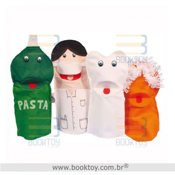 Material: 4 fantoches de mão, representando um Dentista, um dente, a escova e a pasta de dentes. Especialmente criado para ajudar pais e profissionais na transmissão de noções de higiene dentária.