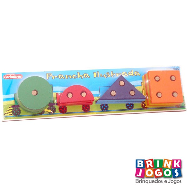 01 base medindo 350mm x 90mm x 54mm, com decoração em 04 cores, contendo 16 peças de formas geométricas para encaixar nos pinos da base, todas as peças pintadas.