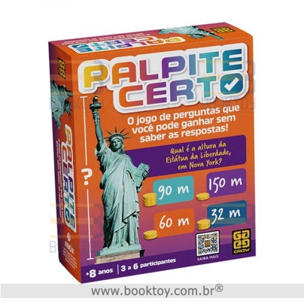 Palpite Certo é um jogo de perguntas e respostas diferente dos demais! Você não precisa saber as respostas exatas para vencer. O importante é apostar no palpite mais próximo! Todas as respostas serão NÚMEROS e QUANTIDADES! Caso ache que o palpite de outro jogador foi o melhor, você pode apostar nele também! É bem simples: alguém lê uma pergunta da carta e todos escrevem suas respostas em cartelas. Essas cartelas são apresentadas a todos os jogadores. Então é hora de apostar! Qual é o palpite mais certo? Sentindo-se confiante? Aposte em si mesmo. Acredita que o palpite de outro jogador é melhor? Aposte no dele. Não faz a menor ideia? Conte com sua sorte e aposte em qualquer palpite!