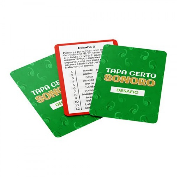 • As duplas de palavras do desafio 2 podem ser reforçadas com outra brincadeira. O adulto fala: quando ouvir duas palavras que comecem com o mesmo som (sons iguais), pode sacudir o chocalho ou bater palmas, escute com atenção. Vamos ver se consegue 10 pontos. Pedir à criança que escreva palavras do jogo, sem ver as cartas, usando somente a memória.