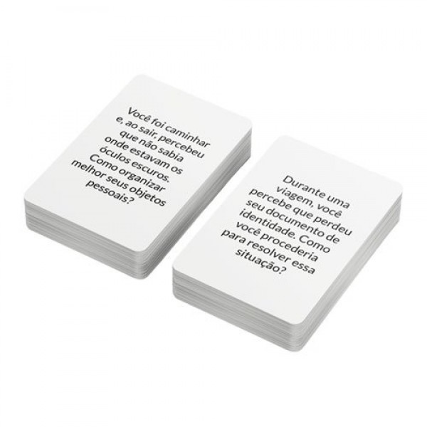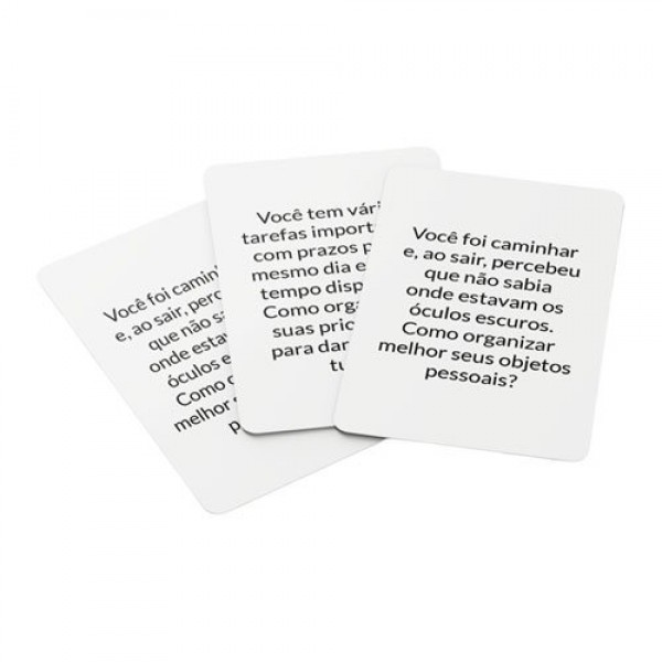O jogo é composto por cartões temáticos, com uma pergunta ou situação problema na frente e um ícone no verso, representando a categoria temática daquela questão.