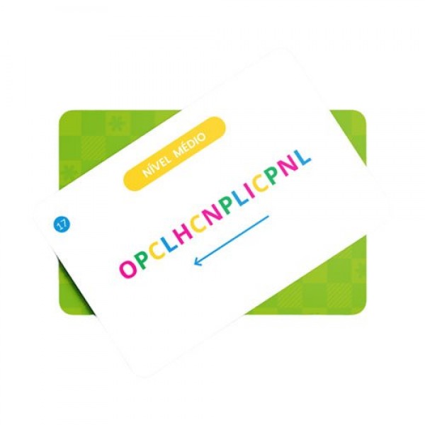Descobrir a palavra escondida eliminando as letras repetidas da sequência apresentada em cada carta. Fique atento(a) ao sentido da leitura, indicado por uma seta, e siga as regras conforme o nível de dificuldade da carta.