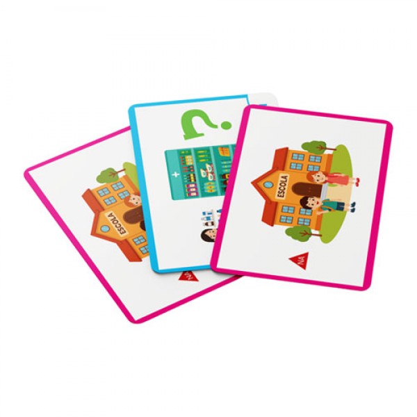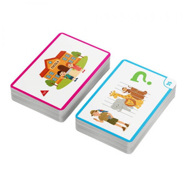 O baralho é composto por dois conjuntos de cartas: 25 como elemento interrogativo "Onde?" e 25 com os elementos de resposta. O mediador pode selecionar a quantidade de cartas que deseja utilizar em cada sessão, regulando a organização dos estímulos e o nível de dificuldade da atividade.