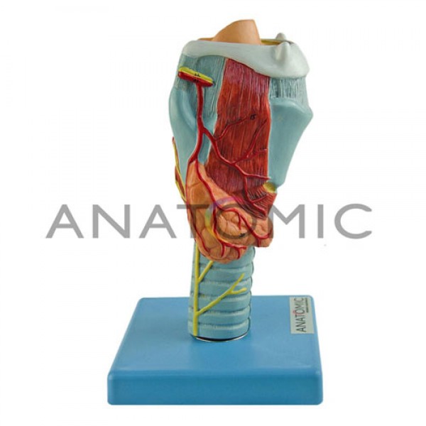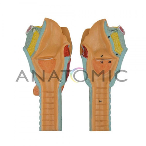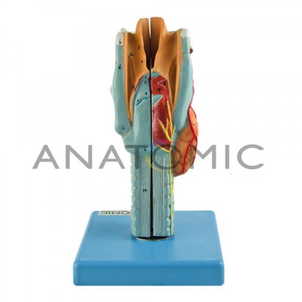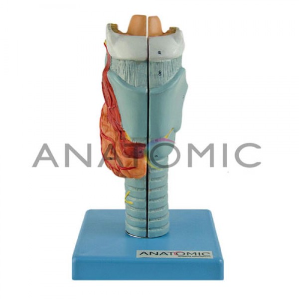 Modelo anatômico da laringe, ampliado aproximadamente 3 vezes o tamanho natural, desmontável em até 2 partes, apresenta 33 pontos numerados e classificados para estudo e demonstração. Montado sobre base.
