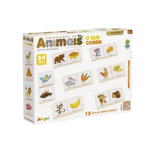 O jogo Conhecendo os Animais da Junges conta com 24 peças em madeira de reflorestamento (MDF), formando 12 cenas que conectam animais aos seus alimentos. Com impressão direta na madeira, garante alta qualidade, durabilidade e resistência, tornando a diversão ainda mais especial!