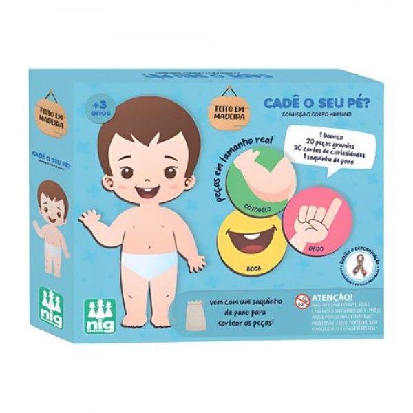Nesse jogo, a criança sorteia uma peça e identifica a parte no seu corpo. Agora ela vai posicionar a peça em cima do boneco, uma de cada vez. Acompanha cartas com curiosidades, que podem se transformar em um jogo da memória: os pares serão formados com 01 carta e 01 peça de madeira. Estimula o aprendizado sobre o Corpo Humano e a Criatividade!